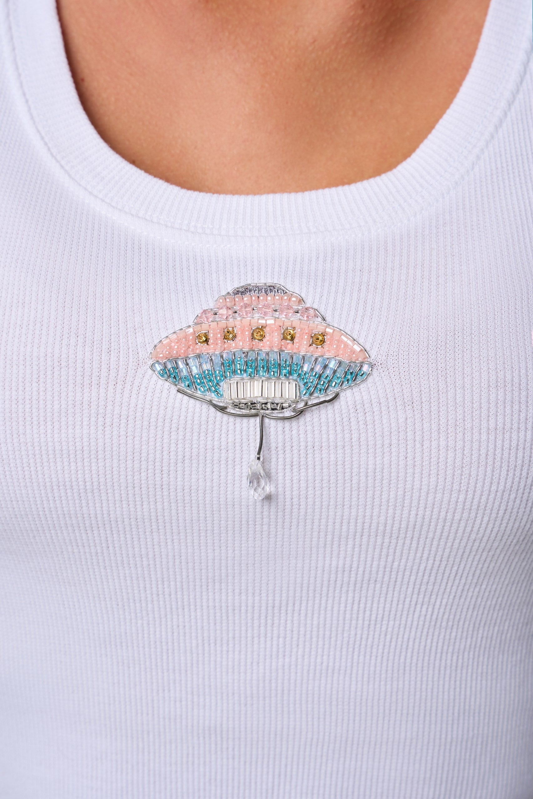 Hand-embroidered spaceship motif.