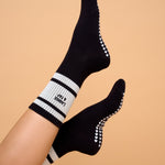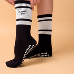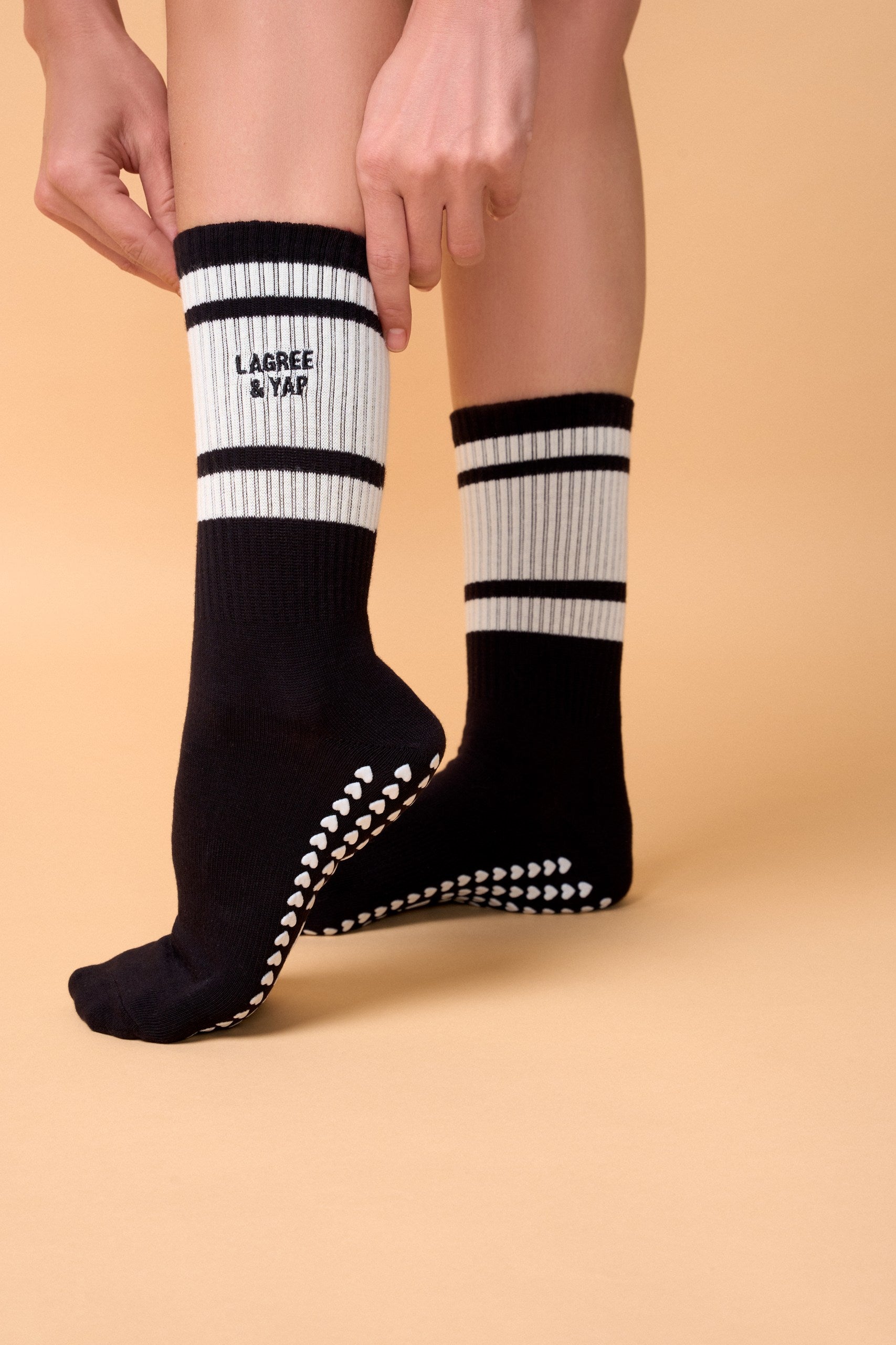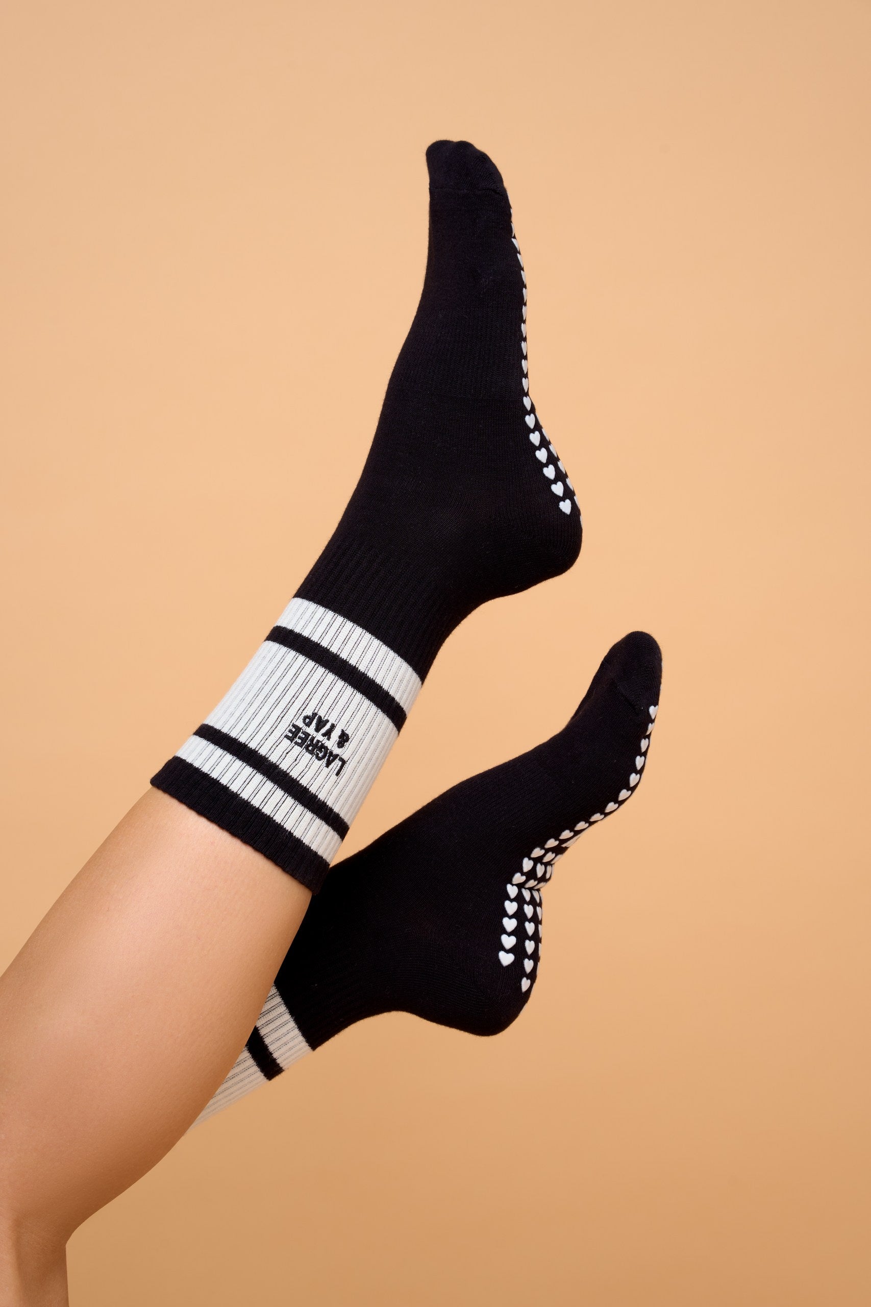 The Lagree & Yap socks are made for the girls who come for the burn and stay for the chat. Designed in soft black and white cotton fabric, these socks are embroidered with the phrase “Lagree & Yap" celebrating strong workouts and hot gossip. The Lagree & Yap socks features built in arch support and white heart grips, which provides a strong grip during workouts and daily movement.