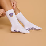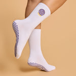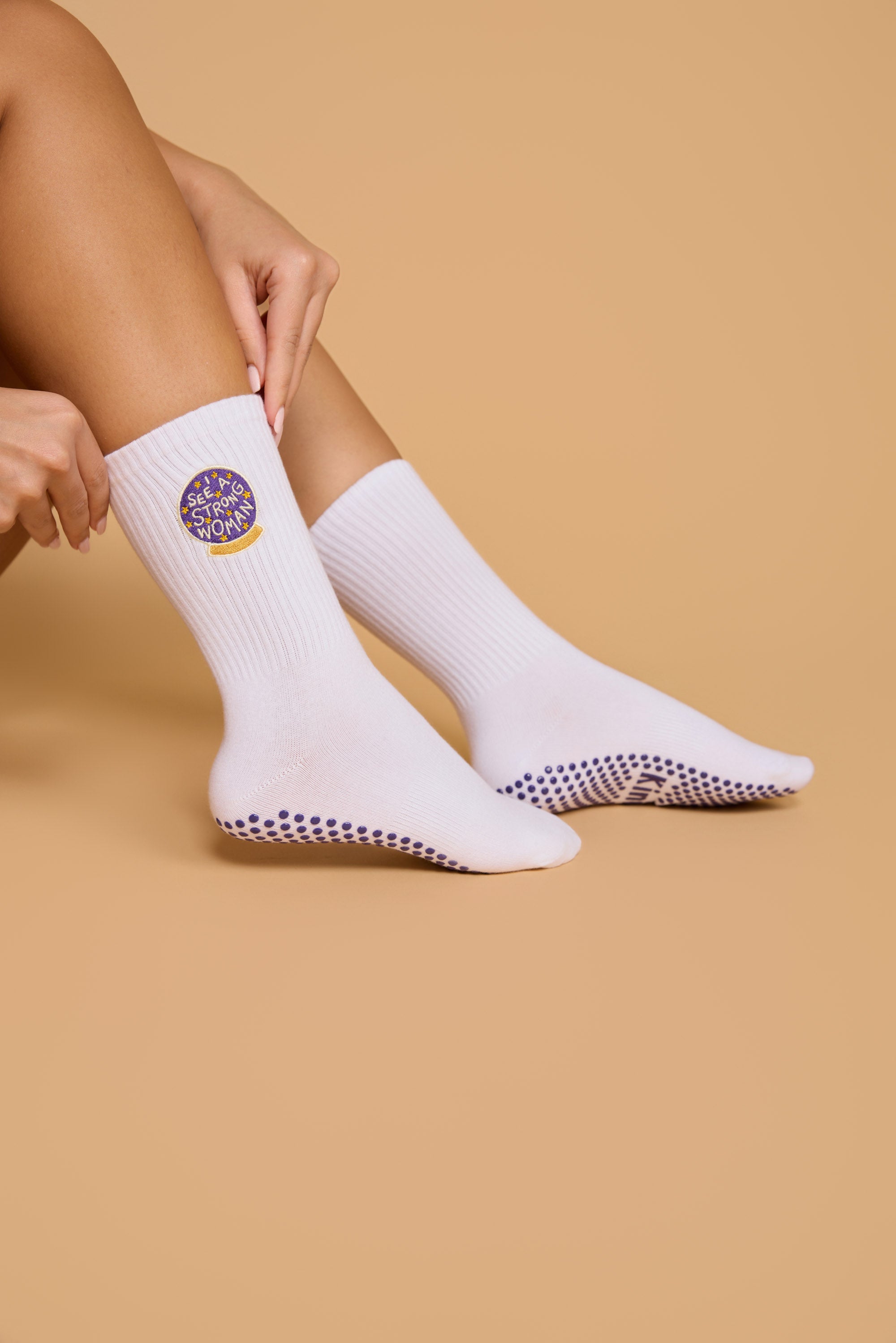 The Strong Woman socks are for the women who wake up everyday and fight for the future they believe in. Designed in soft white cotton fabric, these socks include a delicately embroidered globe with the words “I see a strong woman”, a reminder for every woman on how far she has come and how powerful she really is. The Strong Woman socks features built in arch support and purple dot grips, which provides a strong grip during workouts and daily movement.