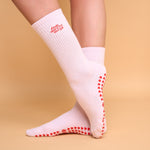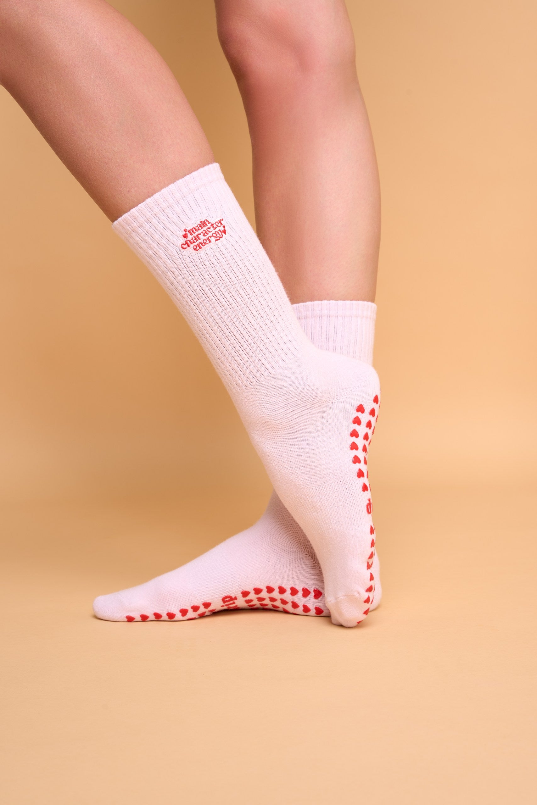 The Main Character socks are made for the "IT girls" who effortlessly own every room they walk into. Designed in a soft pink cotton fabric and embroidered with the statement phrase “Main Character Energy”, these socks are more than just a statement — it's a lifestyle. The Main Character socks features built in arch support and red heart grips, which provides for support and comfort during workouts and daily movement.